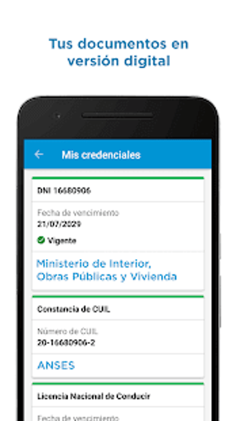 Mi Argentina es una herramienta ideal para tener acceso desde un solo lugar a numerosos documentos y servicios estatales. La aplicación se divide en tres secciones: "Mis documentos" (Cuil, DNI, licencia de conducir, credencial de donante, etc.), "Mis notificaciones" (vencimiento de credenciales, fechas de cobro, turnos...) y "Mis vehículos" (Licencia Nacional de Conducir, Cédula azul o verde, seguro, datos del vehículo, etc.).